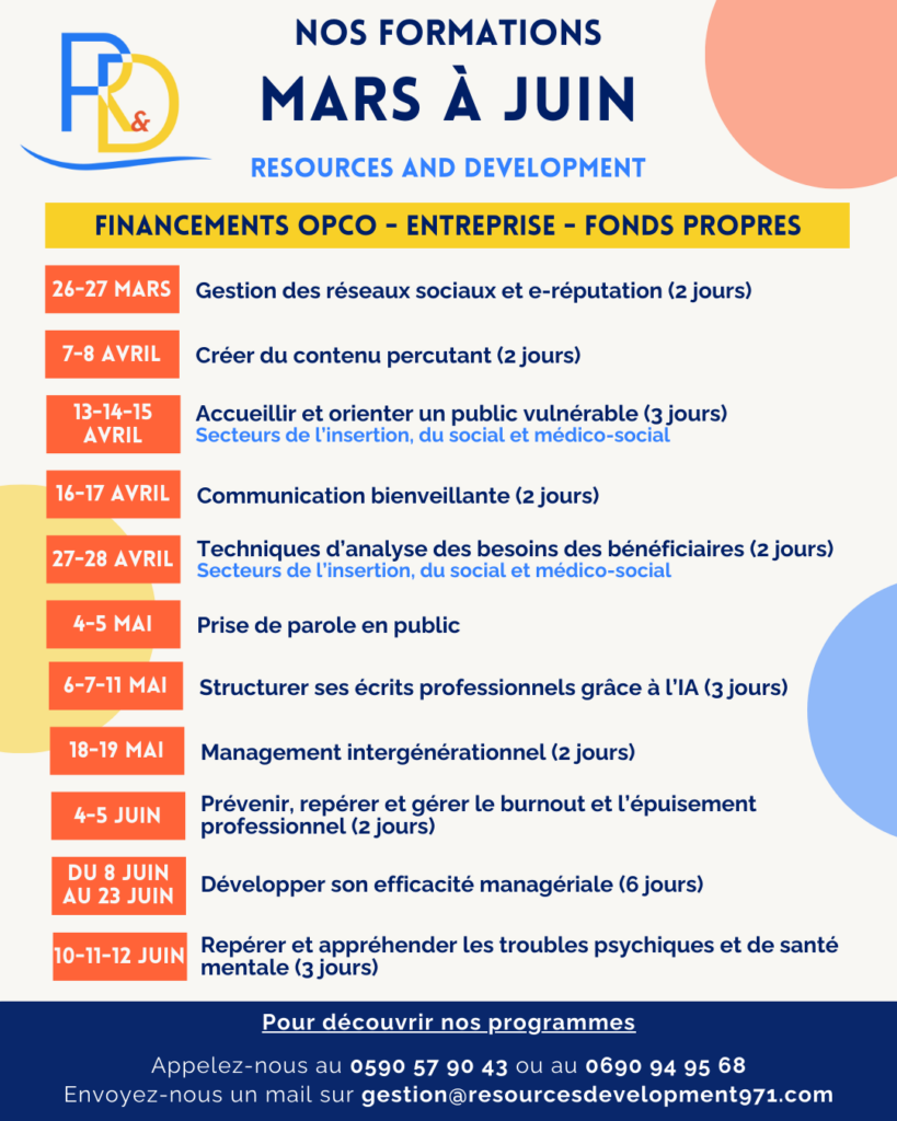 Formation 100% en présentiel dans nos locaux à Jarry, Rue Jean Gothland, ou dans les locaux de l’entreprise.